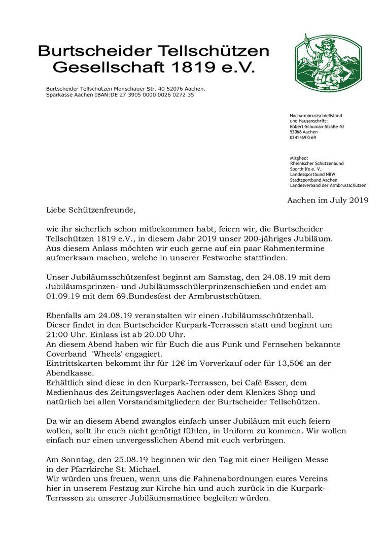 Am Sonntag, dem 25.08.2019 wurde um 07.30 Uhr der König Mark Engelen geweckt, bevor es zum Kirchgang nach St. Michael ging. Auf dem Weg dorthin begleiteten Abordnungen der Bogenschützen Gilde, der St. Johannes Schützen und Spritzemänner (alle aus Burtscheid) , der St. Johannes Schützen BurtscheidDort zelebrierte der Präses der Gesellschaft Pfarrer Faltyn eine tolle Messe. Nach der Kranzniederlegung am Pfarrkreuz zog man durch Burtscheid zur Festmatinee in den Kurpark.